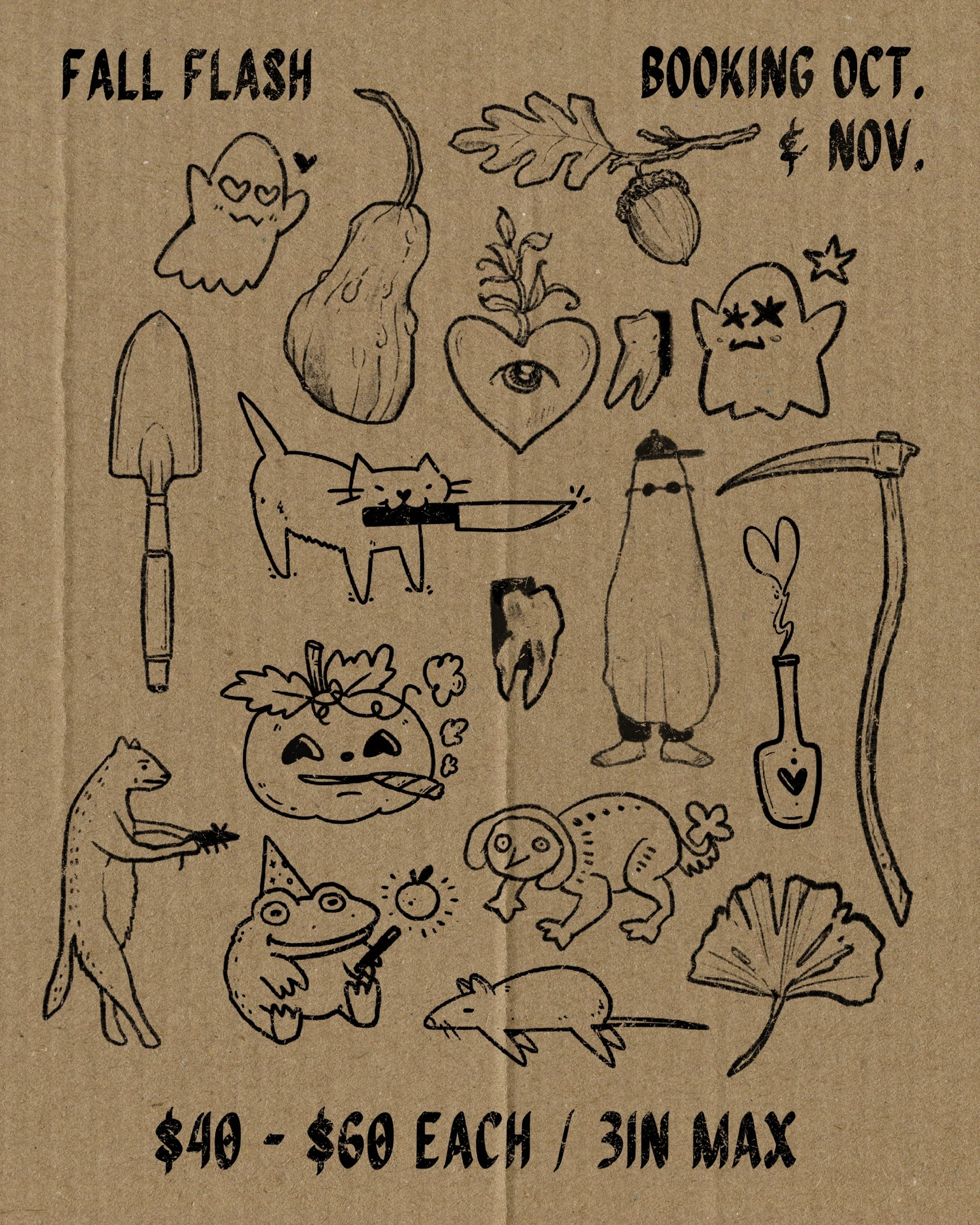 I drew these designs and really want to put them on people! If you'd like one please attach a screenshot of it to your form when you send in a tattoo request. Designs are non-repeatable unless noted otherwise but similar versions can be made. Multiple designs may be requested per tattoo session. Please do not copy or replicate my art without my consent. Thank you!